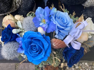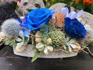 夏らしく貝殻やブルーのエリンジウムを入れてちょっと海をイメージして完成。