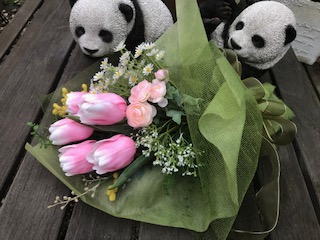 前回アップした花束を色違いのピンクのチューリップで製作し、玄関ドアにかけました♪