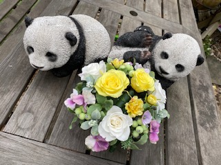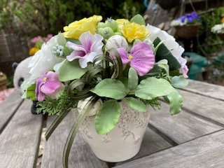 器は白にお花の模様が入ったものを選び、レモンイエロー・白のプリザーブドの薔薇をメインに紫色は春らしいパンジーを入れたラウンドアレンジに仕上げてみました。