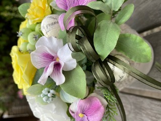 リボンは若草色の細めの柔らかい色合いを。ちょうどイースターの飾りつけが一杯の我が家でしたので、アレンジのアクセントに英字の柄が入った可愛いタマゴを添えて完成♡