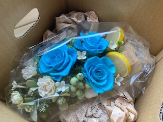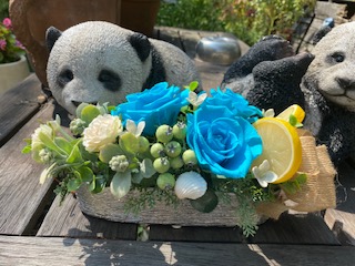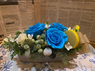 今回はお相手が男性でしたので、メインの薔薇を新色の目の覚めるような鮮やかなカリビアンブルーを使いました。アウトラインはユーカリをあしらいアクセントにレモンと貝殻、白い小花を入れて仕上げてみました。リボンはジュートにして爽やかに完成!