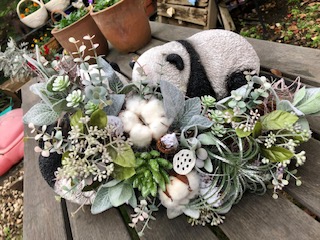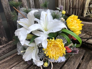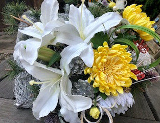 以前から我が家にあったカサブランカと大輪の菊をあしらったアレンジを手直ししてお譲りすることに。併せて春まで飾れる冬アレンジが欲しいとの事で、クレッセント型ボディーにコットンをメインにとセダムや木の実をあしらった作品をご提案。小1のT君を体操教室へ送り出し、お迎えに行くまでの隙間時間に我が家にご来訪され、コーヒーしながら近況報告のおしゃべりタイムを楽しみました。年末年始を控え何かと忙しいですが、年内チャンスあらばゆっくりランチ出来たらよいねー!と作品をお持ち帰りになりました。