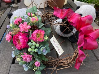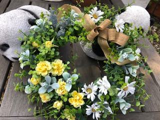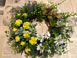 学生時代からの悪友で偶然私の実家のすぐそばに嫁いだMちゃん。子供が小さい時はよく彼女のマンションのゲストルームで出張レッスンをしたのを思い出します。今では月1くらいのペースでスーパー銭湯で夜お風呂飲みしていますが、そんな彼女から玄関ドアのリースを気分を変えたいのでリメイクして欲しいとのご依頼。1つはハロウイン仕様でしたがガラッと雰囲気を変えてとのことで2ポイントの春らしいアレンジに。ピンクのラナンキュラスをメインにアウトラインはアイビーの葉で作り、周りには薔薇の小花やベリーを散らして完成。もう1つはオールラウンドのお花がいっぱいのリースでしたが、ベースのユーカリのもう劣化してボロボロでしたので、全て外して巻きなおし、明るい黄色・マーガレットの白・ラベンダーも入れて春らしく仕上げました。お渡しは先日行ったお風呂の駐車場で。昔からほぼ私の全てを知っている彼女とは気負いなく付き合えて楽しい時間です。私はゴルフ・彼女はテニスに夢中な今ですが、春になったら一緒にスポーツもしたいものです。