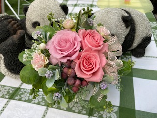 ピンクがメインで可愛らしい感じにとの事でしたので、ピンクのプリザーブドの薔薇2色で3輪を中心に、アウトラインは葉っぱの形が可愛いユーカリを使用。器も白がベースで高さがあるものをセレクトし、リボンもレース仕立てにして可愛く仕上げました。